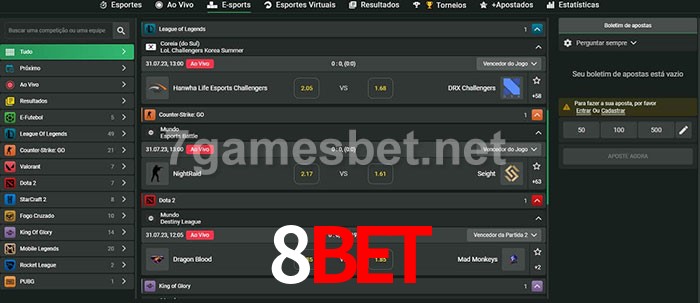 O 8Bet oferece uma grande seleção de opções de apostas em e-sports com probabilidades competitivas